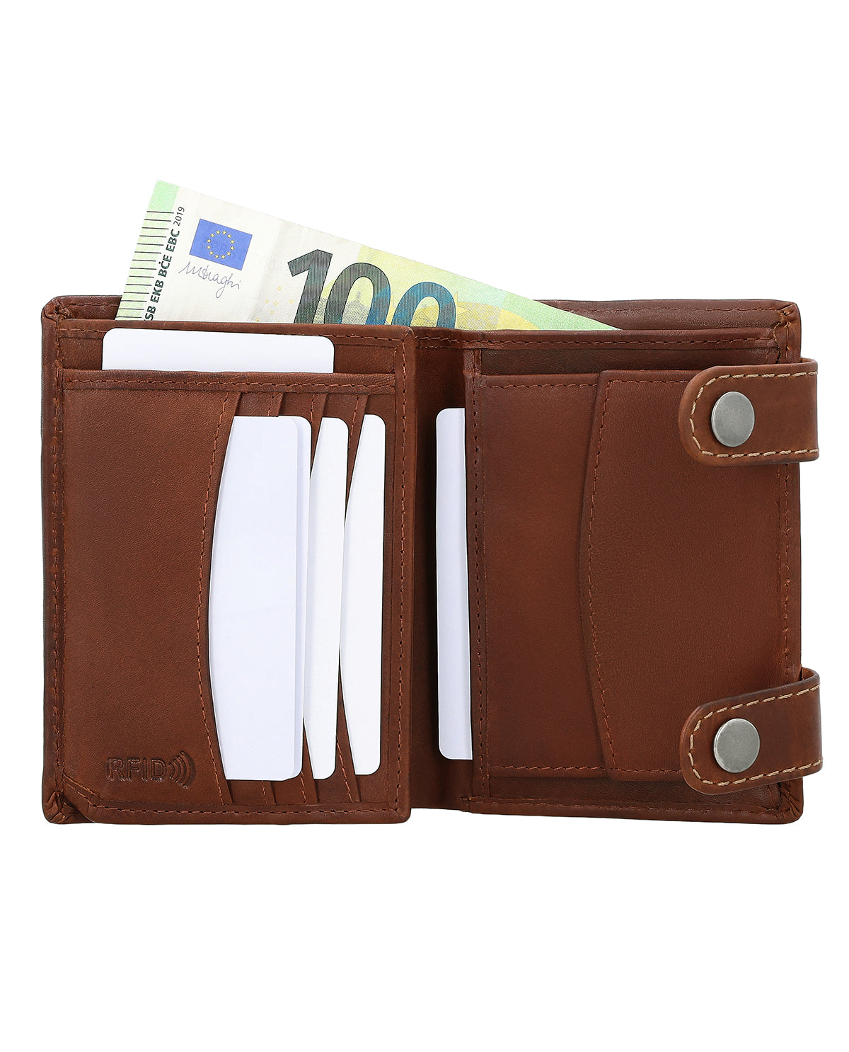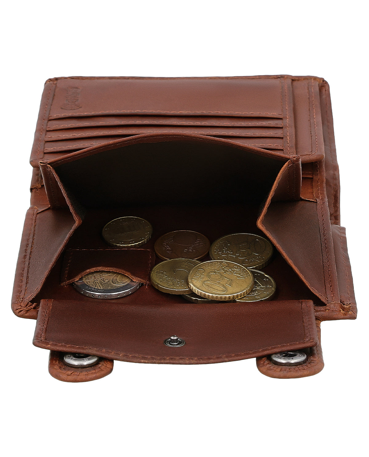 Wewnątrz „Ben” posiada przegródkę na banknoty, miejsce na sześć kart oraz przegródkę na monety, zamykaną na zatrzask. Dzięki temu nic nie wypadnie. Na drobne codzienne wydatki przewidziano dodatkową przegródkę na jedną monetę – idealną, gdy chcesz mieć pod ręką odpowiednią monetę. Portfel wykonany jest z wysokiej jakości skóry bydlęcej i zamykany na dwa zatrzaski, które dodatkowo wyposażone są w zakładki. W górnej części znajduje się otwór do zamocowania dołączonego łańcuszka do spodni. Dzięki temu możesz chronić swój portfel przed złodziejami, zwłaszcza gdy chowasz go w tylnej kieszeni spodni. Wrzuć go do kieszeni lub kurtki – i ruszaj w drogę z portfelem „Ben”!