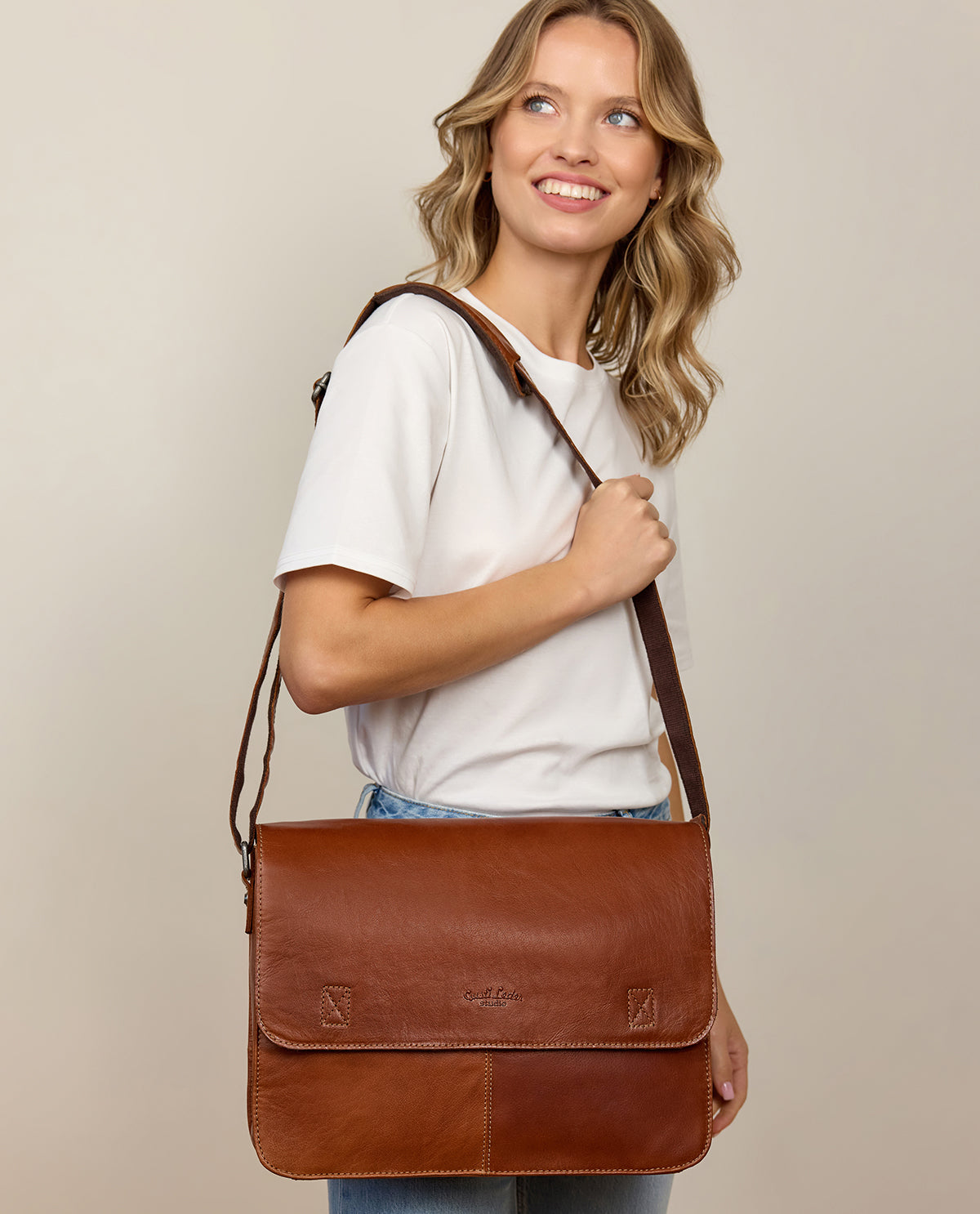 Przede wszystkim przestronna komora główna: z łatwością pomieści laptopy o przekątnej do 15 cali; Można tu łatwo schować zeszyty w formacie A4, a także książki, piórniki, czasopisma i wiele innych. Możesz zamknąć „Pharell” dwoma okrągłymi zapięciami magnetycznymi, które są ozdobione rustykalnymi przeszyciami z przodu. Oznacza to, że wszystkie Twoje rzeczy są chronione przed kurzem i wilgocią, gdy jesteś poza domem. Dla naprawdę ważnych dokumentów „Pharell” ma dodatkową kieszeń zapinaną na zamek z tyłu.Wszystko to możesz nosić na regulowanym pasku. Skóra garbowana roślinnie dopełni Twój wygląd, ale bez wysuwania się na pierwszy plan.