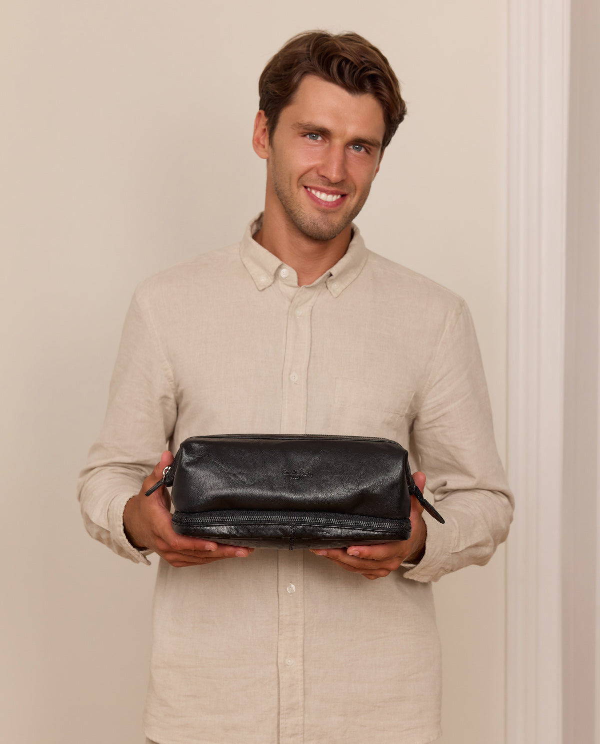 Ta torba będzie idealnym towarzyszem Twoich produktów higienicznych w podróży, ponieważ jest wodoodporna ! Jeśli coś przecieka, polibawełna wewnątrz zapobiega przedostawaniu się płynu, a następnie można to łatwo wytrzeć. Przestronna komora wewnętrzna oferuje dużo miejsca na Twoje rzeczy. W ten sposób możesz przechowywać szampon, dezodorant czy szczoteczki do zębów. Wytrzymała skóra bawola jest wyjątkowo trwała i zapewnia torbie stabilność, której potrzebujesz. Mała pętelka z boku zwiększa komfort noszenia, a torbę można również łatwo zawiesić. Wnętrze zabezpieczone jest zamkiem błyskawicznym. Dzięki temu będziesz przygotowany na każdą podróż.