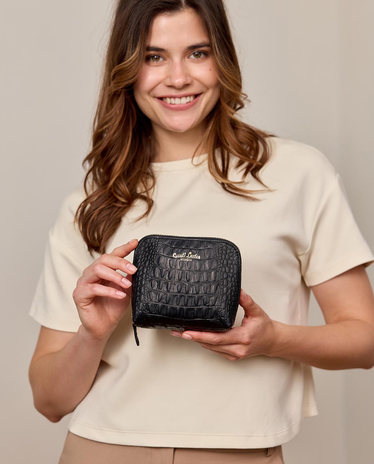 Verlierst Du oft den Überblick in Deiner Tasche und suchst ewig nach Deiner Wimperntusche oder anderen Kleinigkeiten? Dann ist "Leo" genau das Richtige für Dich! Dieses wunderschöne, kleine Täschchen sorgt für Ordnung in den unendlichen Tiefen Deiner Tasche und überzeugt mit seinem stilvollen Design. Gefertigt aus hochwertigem schwarzem Rindsleder, strahlt es eine edle Eleganz aus, die sich mühelos in Deinen Alltag einfügt. Der umlaufende Akzent-Reißverschluss betont die klassische Optik und macht "Leo" zu einem stilvollen Begleiter – dezent, aber dennoch ein Blickfang.
