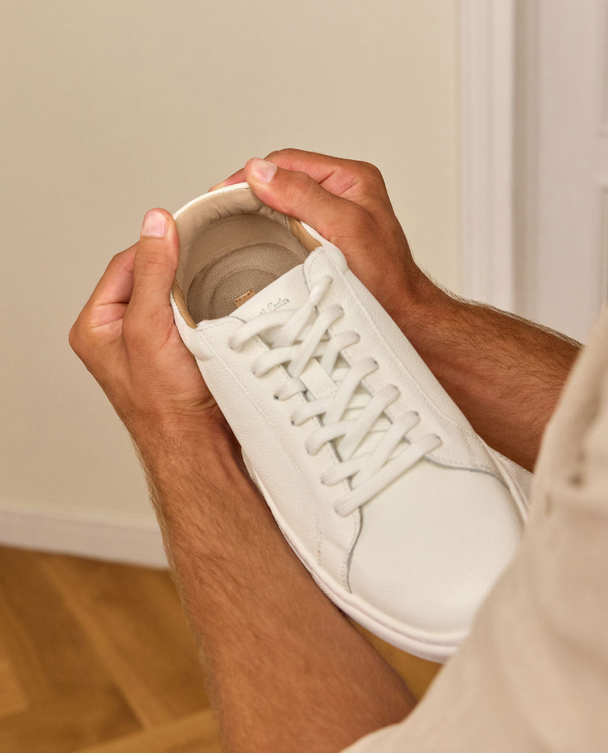 Der "Mando" Sneaker ist die perfekte Wahl für alle, die einen lässigen und zugleich eleganten Look suchen. Hergestellt aus hochwertigem Rindsleder, bietet er nicht nur eine stilvolle Optik, sondern auch außergewöhnlichen Komfort. Die weiße Farbe verleiht dem Sneaker eine zeitlose Ausstrahlung, die sowohl im Alltag als auch bei besonderen Anlässen bestens zur Geltung kommt. Die Eva-Sohle (Ethylenvinylacetat) sorgt für eine leichte, flexible und zugleich langlebige Basis, die Dir den ganzen Tag über ein angenehmes Tragegefühl bietet.