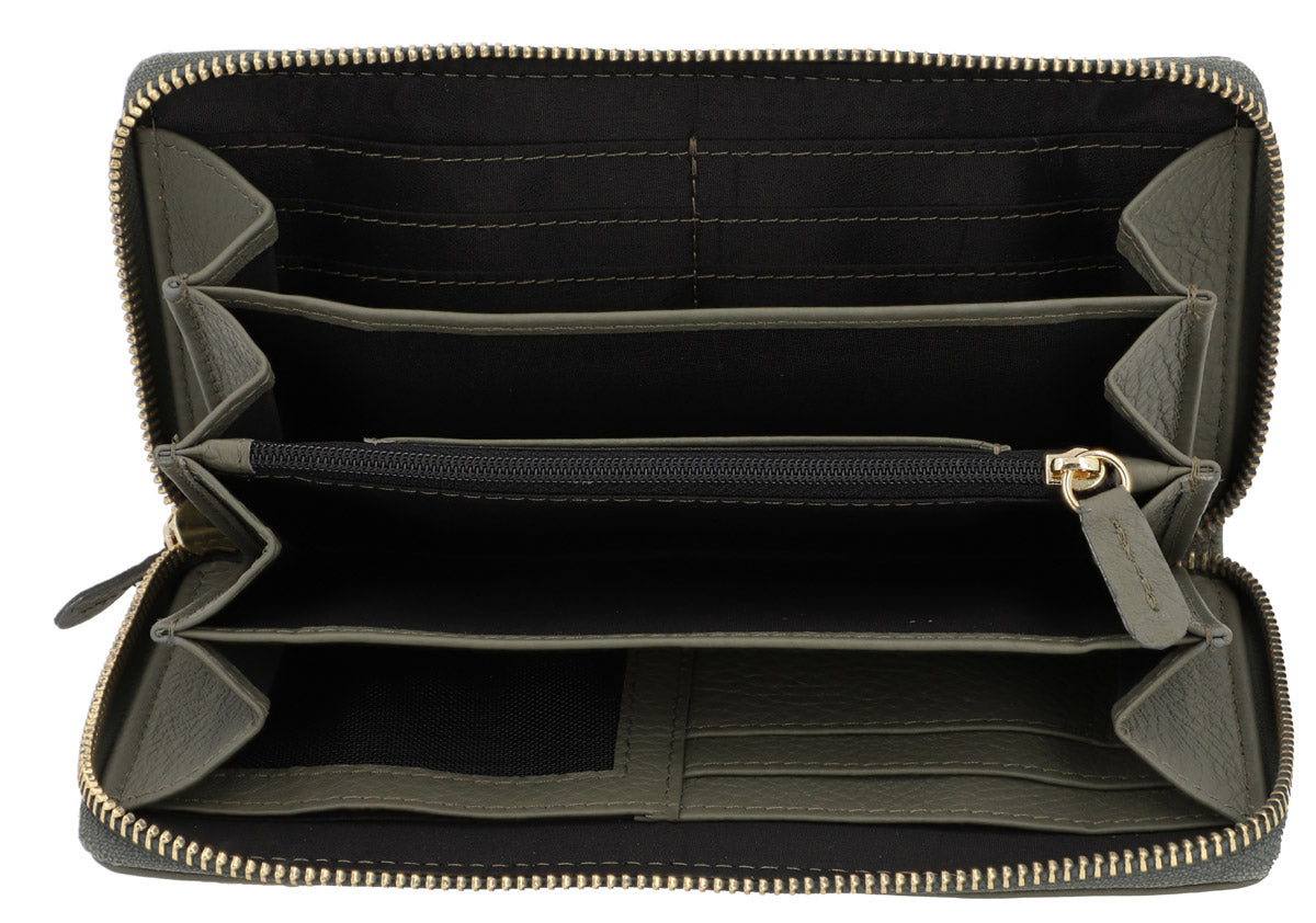 Innen verfügt „Cara“ über 5 Innenfächer - so hast du Platz für all deine kleinen und großen Geldscheine und Münzen.Die beiden Außenfächer bieten Platz für 10 Karten.Darüber hinaus hast ein Münzfach in der Mitte welches du mit Reißverschluss abschließen kannst. Neben dem Münzfach auf beiden Seiten hast du dann schlußendlich Platz fürd deine Geldscheine. Zusätzlich hast du hinten noch Reißverschlussfach für das ein oder andere Mitbringsel. Ein großer Reißverschluss schützt dabei dein Hab und Gut perfekt, sodass auch nichts rausfallen kann."Cara" - eine Rundumpaket was Geldbörsen betrifft!