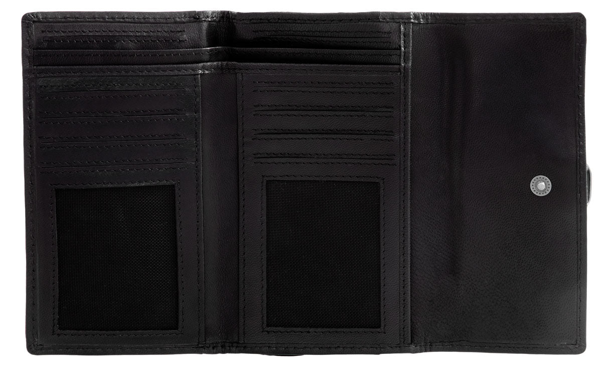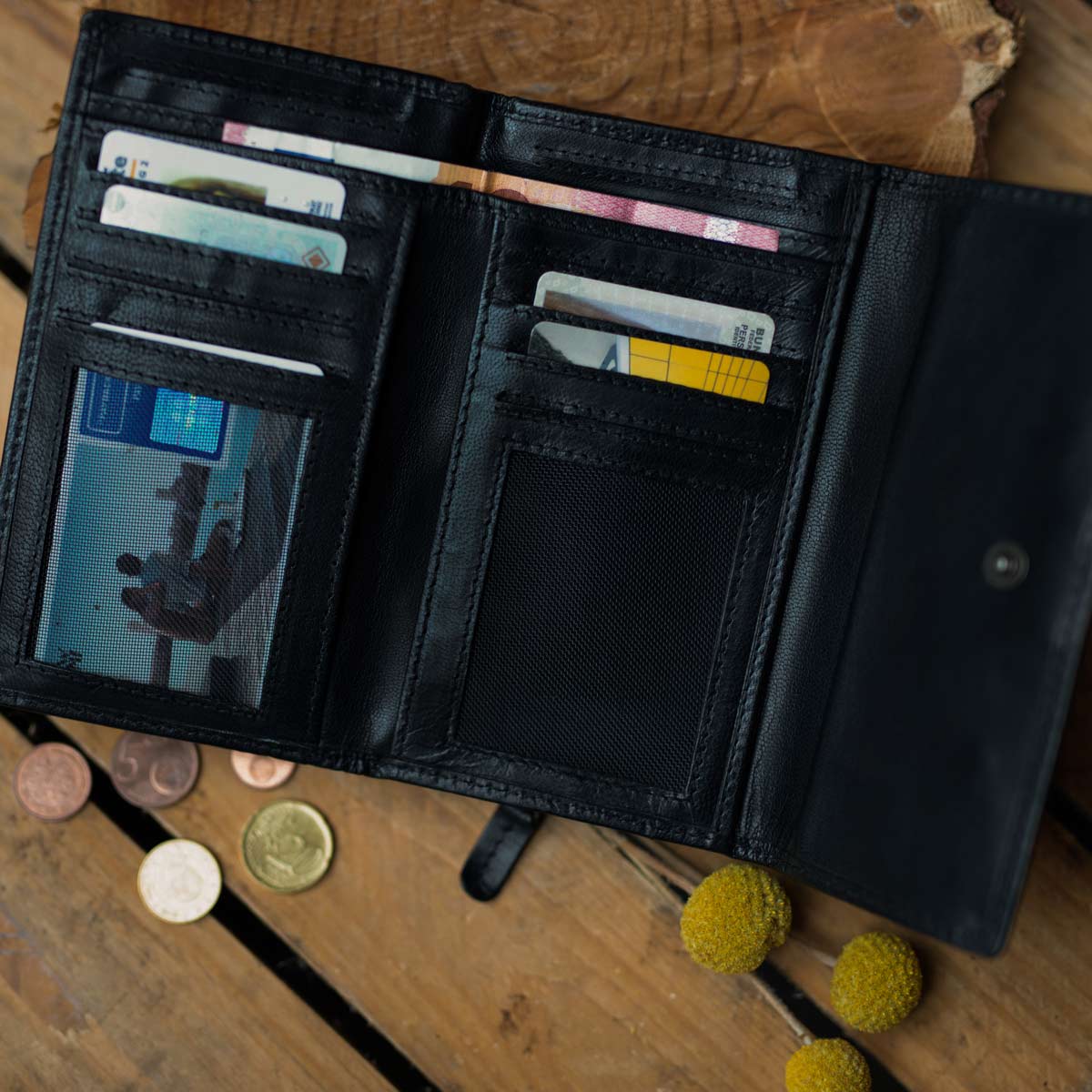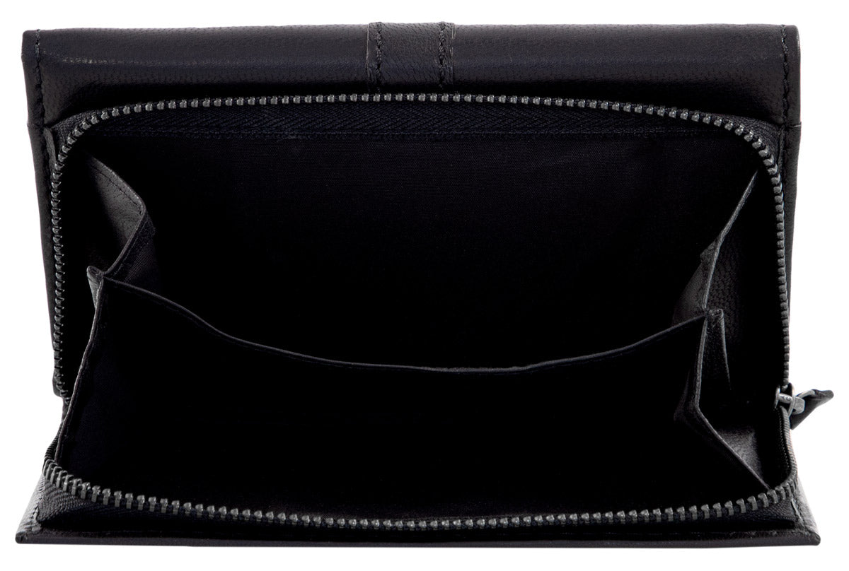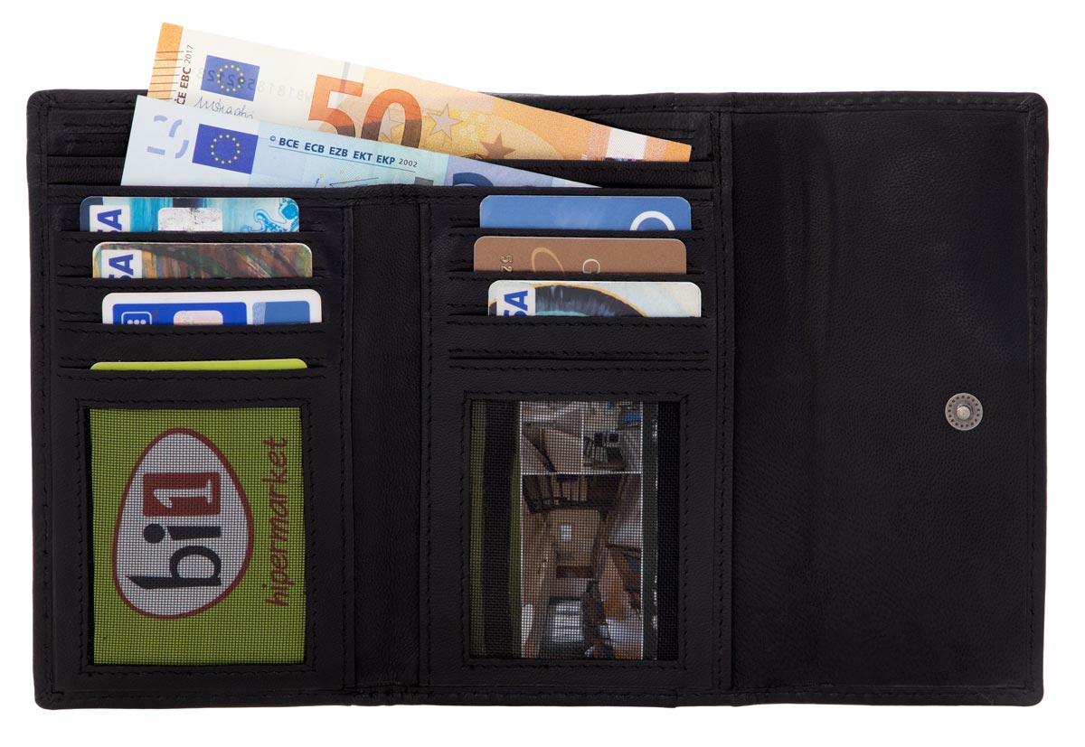 Im Inneren überzeugt "Mae" mit einem sehr gut strukturierten Ordnungssystem aus zwei Geldscheinfächern, einem separaten Doppel-Münzfach, das über einen eigenen Reißverschlussgeöffnet werden kann, und insgesamt 8 Steckfächern für (mindestens) ebenso viele Karten.Zwei seitlich integrierte Einsteckfächer erweitern den Stauraum der Börse noch zusätzlich, ebenso wie die beiden Sichtfenster, in die problemlos Ausweis, Führerschein oder auch Fotos von den Liebsten untergebracht werden können.