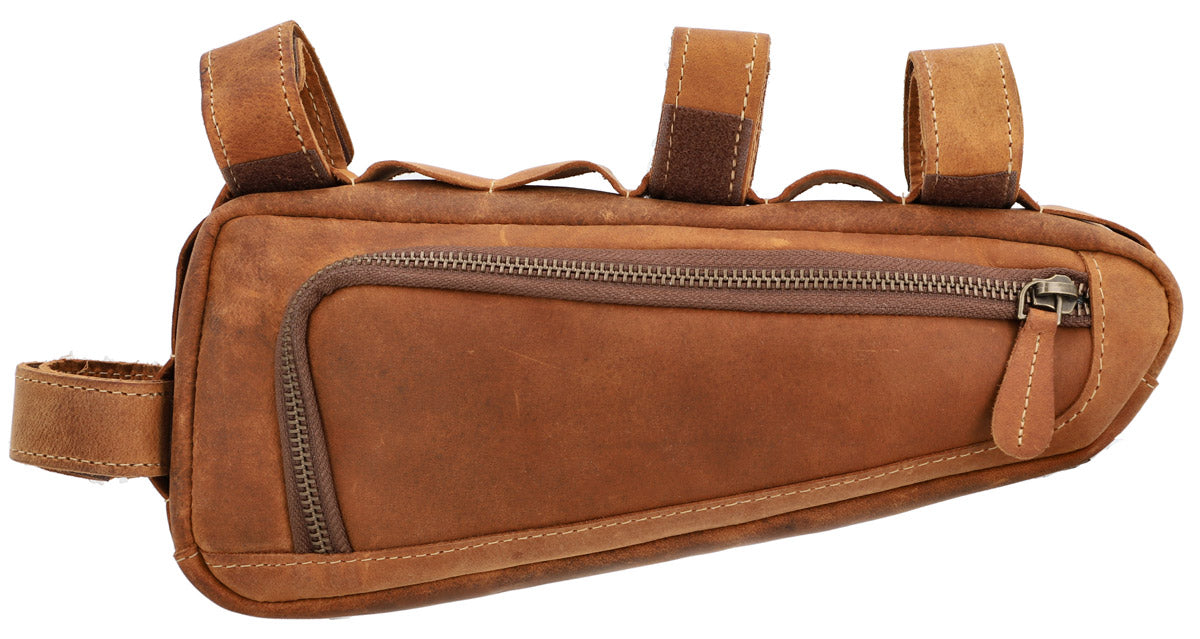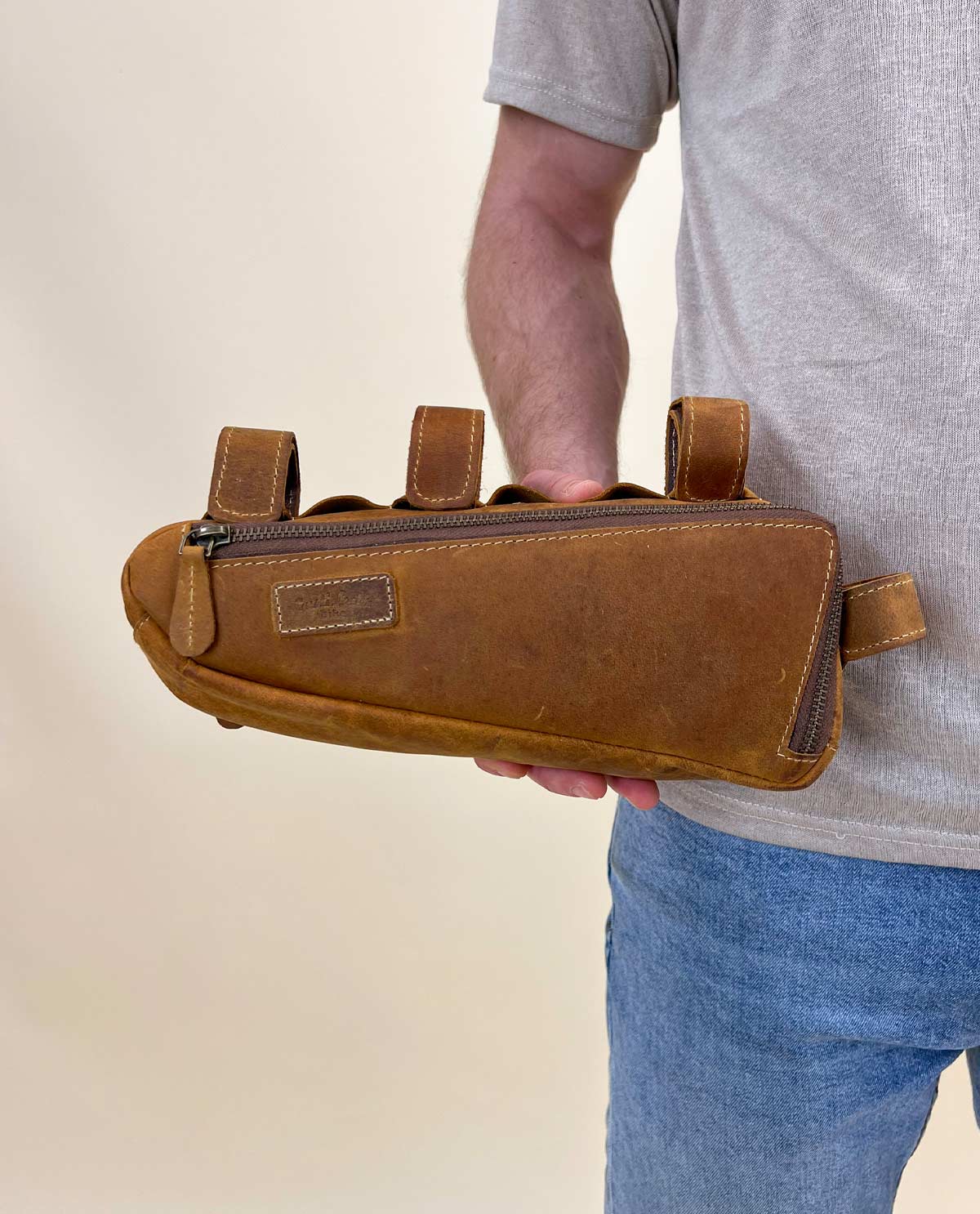 „Maurice G.“ überzeugt nicht nur mit seinem wasserabweisenden & abwischbaren Polycotton-Innenfutter, sondern auch mit seiner sicheren Befestigung. Dank vier stabilen Lederriemen sitzt die Tasche fest am Rahmen. Zusätzlich sorgen Lederriemen mit Klettverschluss für eine zuverlässige Fixierung um die Querstange, sodass die Tasche auch auf unebenen Wegen sicher an Ort und Stelle bleibt. Sie bietet ausreichend Platz für Werkzeug, Schloss, Regencape & weitere Essentials. Die stabilen Reißverschlüsse an beiden Seiten gewährleisten, dass nichts herausfällt – selbst auf holprigen Strecken.