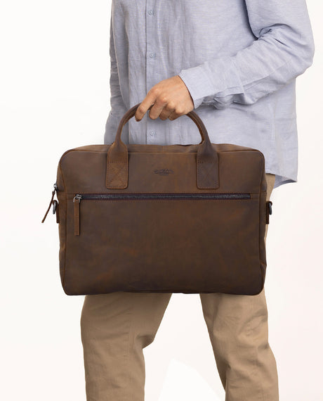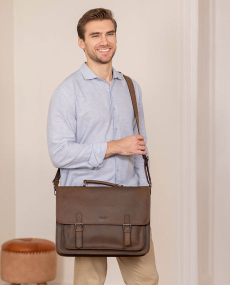 - A leather briefcase for the office is a perfect choice. Briefcases made of smooth leather have a classic, elegant look, while models with a brushed surface have a rougher finish.