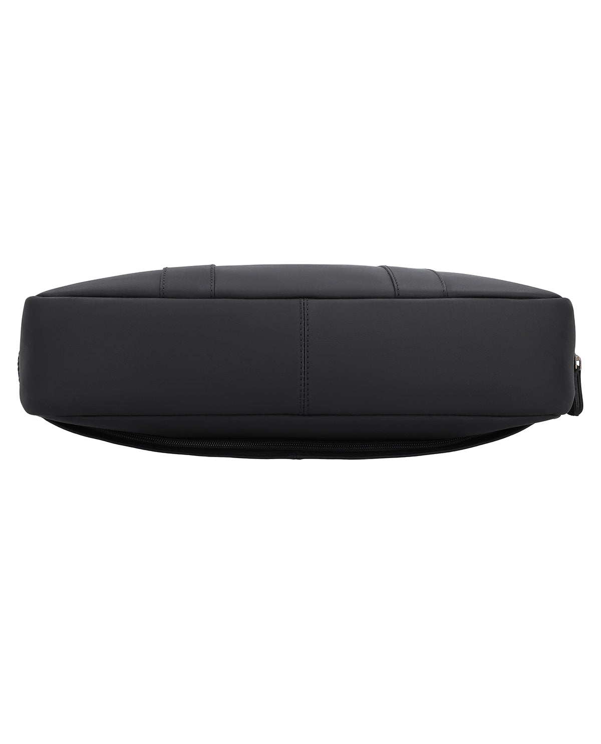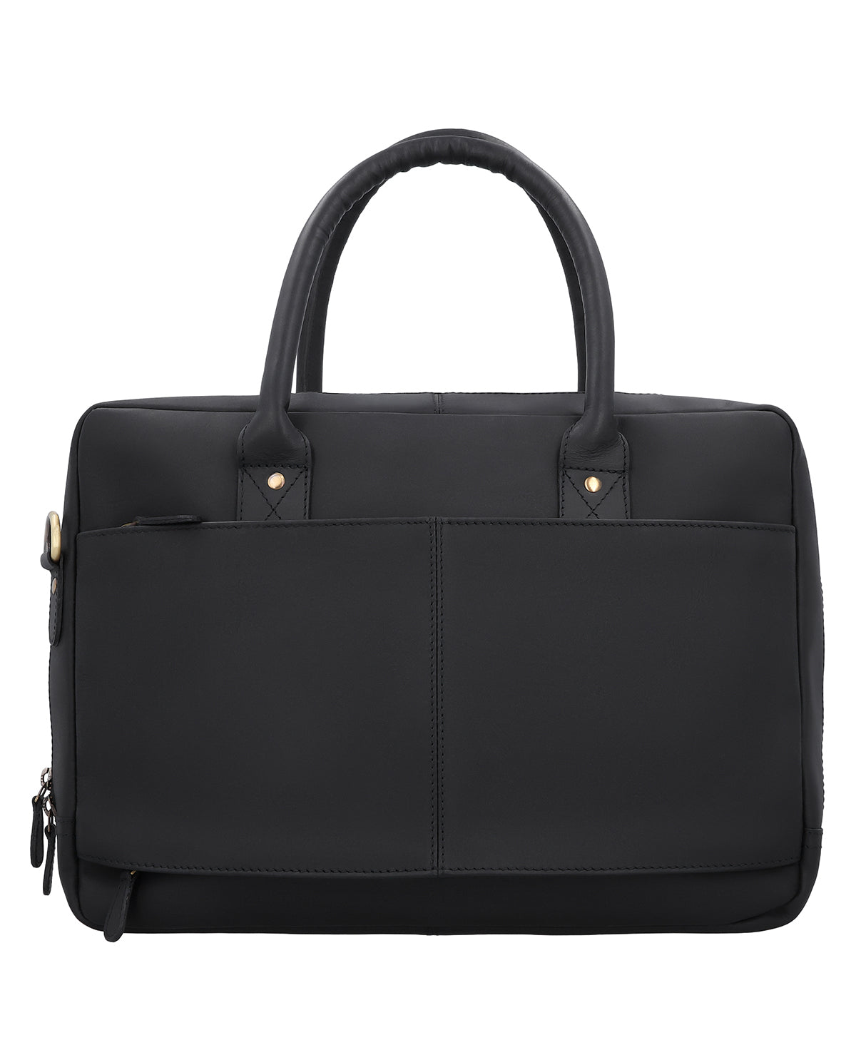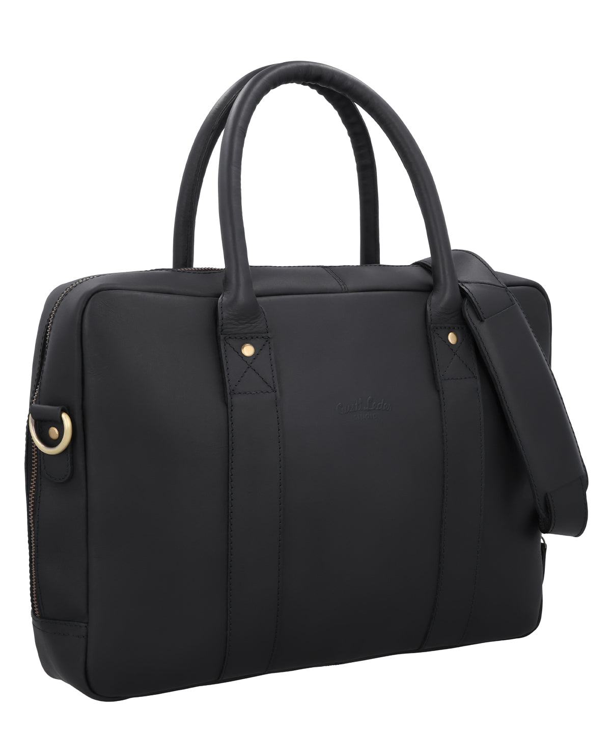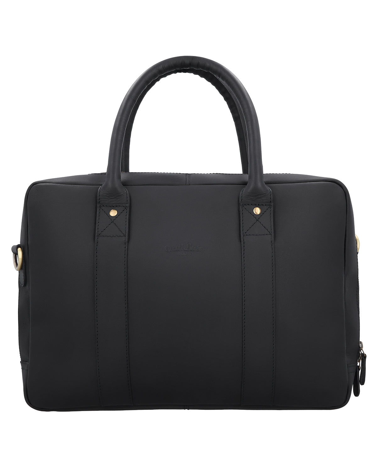 Inside, a zippered compartment complements the clear layout, while an integrated key ring keeps important items within easy reach. The adjustable and removable shoulder strap offers you flexible carrying options, supported by soft shoulder padding for added comfort. An engraving patch on the outside allows you to personalize your bag. "Fynn" is a black leather business bag for men and women that combines functionality, stability, and everyday practicality in a modern design.