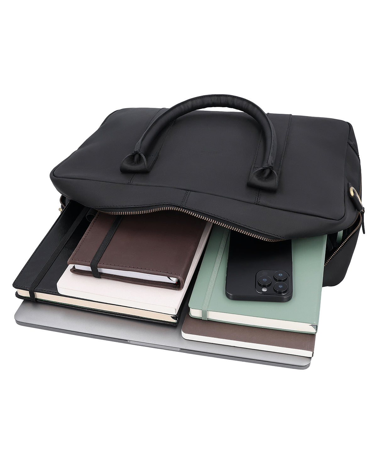 The black "Fynn" laptop bag is a leather bag for men and women that combines organization and mobility. An integrated laptop compartment reliably protects your device, while a hidden AirTag compartment offers additional security. Thanks to the practical suitcase holder on the back, "Fynn" can be conveniently attached to your trolley – perfect for business trips or commutes. One main compartment closes securely with a zipper and ensures a clear, tidy overall look.