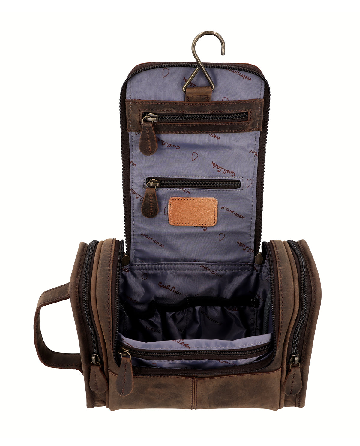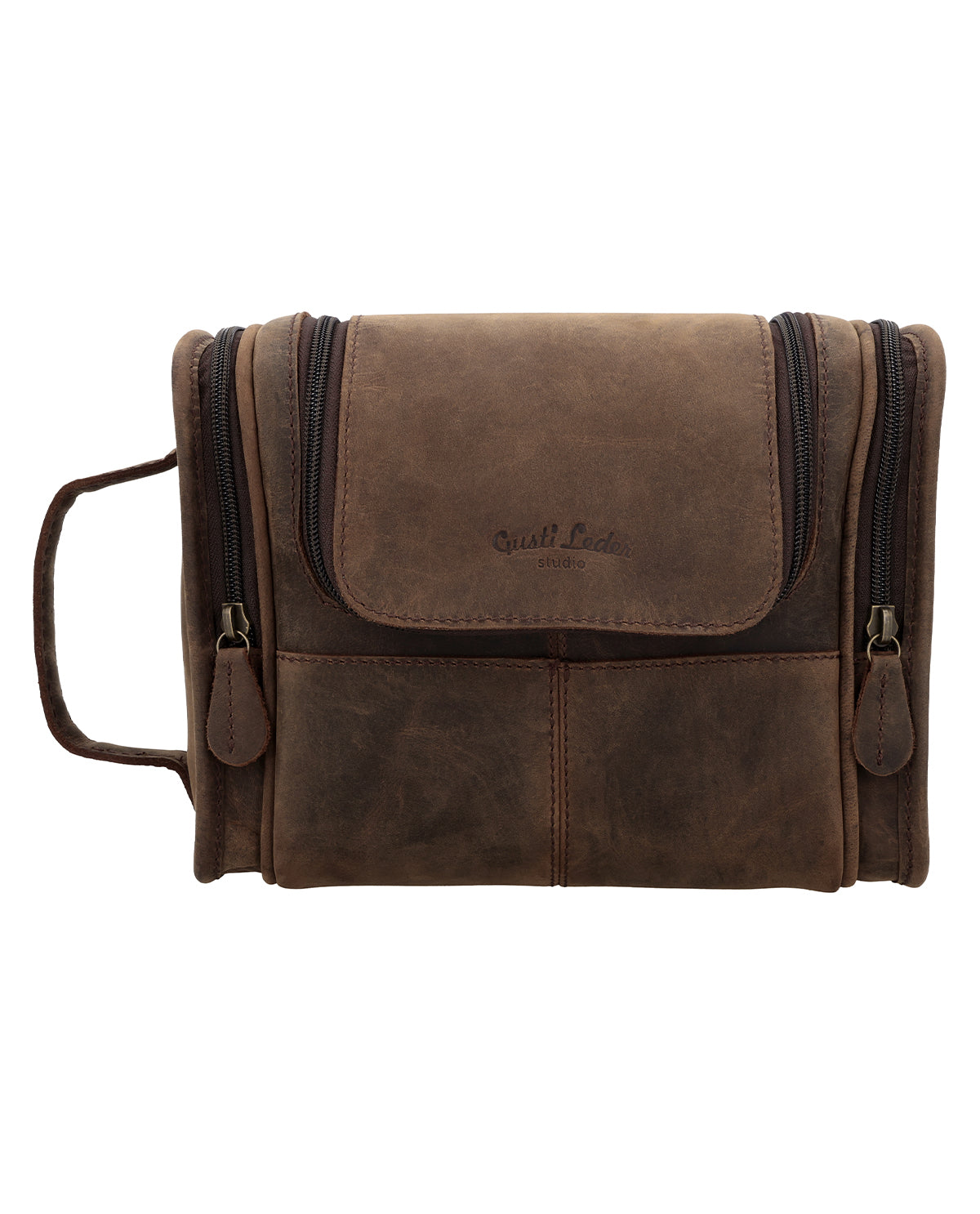 You could play hide-and-seek in this toiletry bag if you were an elf. Super spacious “Chester” has plenty of space for your toiletries. There are multiple pockets inside where you can organise your bathroom essentials. Use the two side pockets for things you need easy access to. Hang “Chester” up using the hanging loop while you’re using him. “Chester’s” lining is water-resistant, so no need to worry about small spillages. We’ve created a Gusti Leather toiletry bag that isn’t just functional, it’s super stylish too. Choose between a stylish brown or elegant black toiletry bag for your next trip away. What more could you want? You’ll never have to compromise in the bathroom again with our spacious toiletry bag “Chester”.