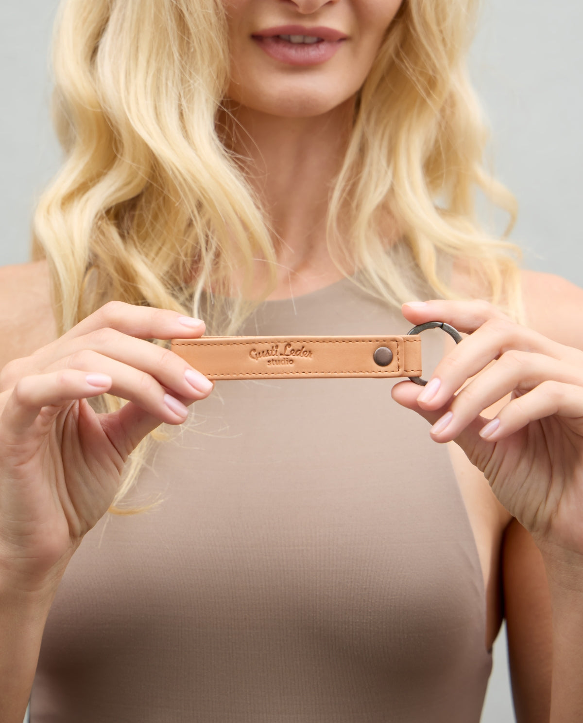 The "Jessy" key ring is a stylish companion that harmoniously combines functionality and elegance. Made from high-quality leather, it impresses with its pleasant feel and durable workmanship. The sturdy metal ring keeps your keys securely together, while the simple, modern design ensures that "Jessy" cuts a fine figure both in everyday life and on the go. An accessory that adds style to your key ring while reliably serving its purpose.
