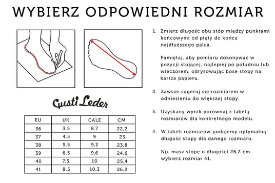 Jeśli wahasz się pomiędzy rozmiarami, zalecamy wybór większego – szczególnie w przypadku zamkniętych stylów, takich jak botki, dla większego komfortu.