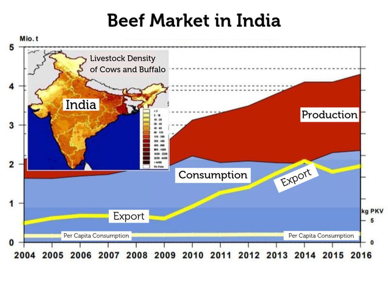 Obecnie Indie sąjednym z największych producentów wołowiny na świecie. Dla porównania: w UE rocznie produkuje się około 8 mln ton wołowiny. W Indiach jest to 4,3 mln ton mięsa. Wołowina w Indiach jest więc nie tylko spożywana, ale także produkowana na dużą skalę. Większość rzeźni w Indiach znajduje się na południu (Chennai) i na północy (Uttar Pradesh i Kolkata). Z tych miejsc pochodzi nawet 50% mięsa eksportowanego do Kataru i Arabii Saudyjskiej. Dlaczego? Ubój zwierząt odbywa się zgodnie z dokładnymi przepisami, które są zakorzenione w islamie. Tylko jeśli mięso jest“halal”, jest spożywane w miejscach o islamskim charakterze, takich jak Katar.