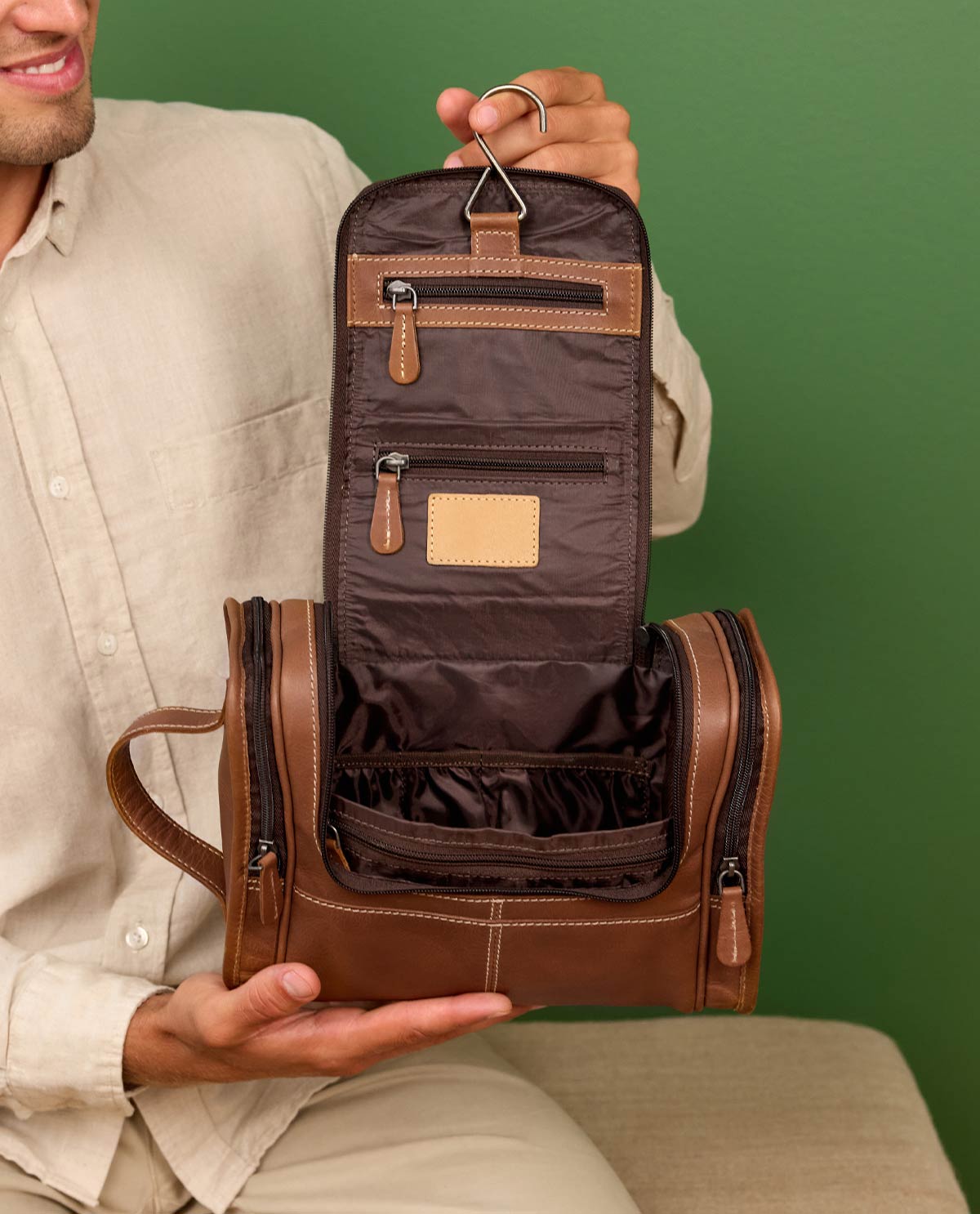 Kosmetyczka "Chester" to idealny towarzysz Twoich podróży lub codziennego użytku. Wykonana z wysokiej jakości ciemnobrązowej skóry, łączy elegancki wygląd z wysoką funkcjonalnością. Wodoodporna podszewka niezawodnie chroni Twoje artykuły higieniczne przed wilgocią i zapewnia, że zawsze możesz polegać na swojej torbie. Torba oferuje liczne kieszenie o różnych rozmiarach, w których możesz idealnie przechowywać swoje kosmetyki, produkty pielęgnacyjne i akcesoria.