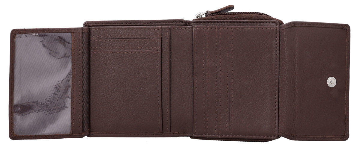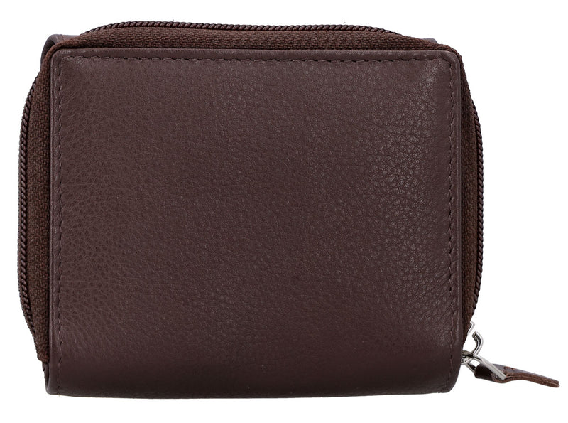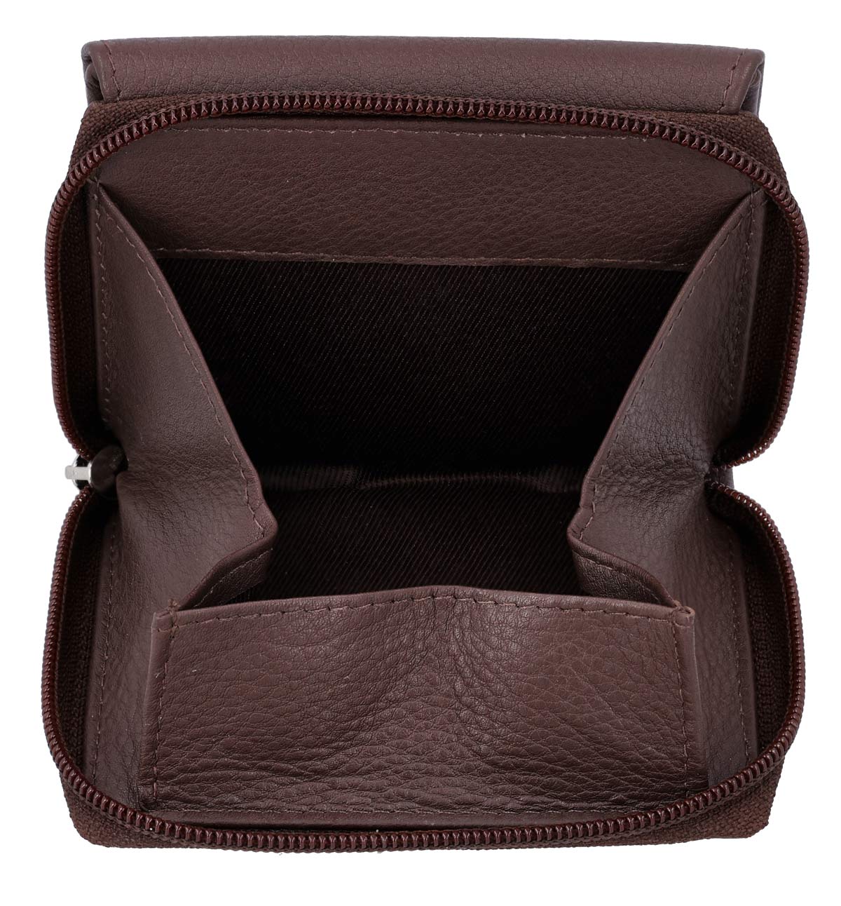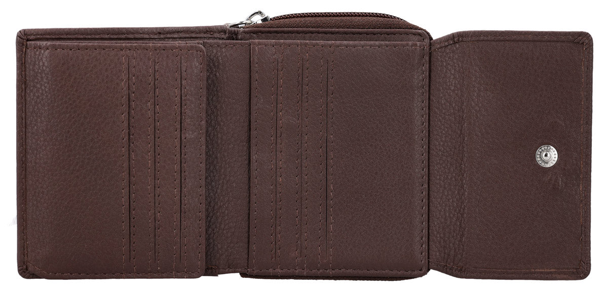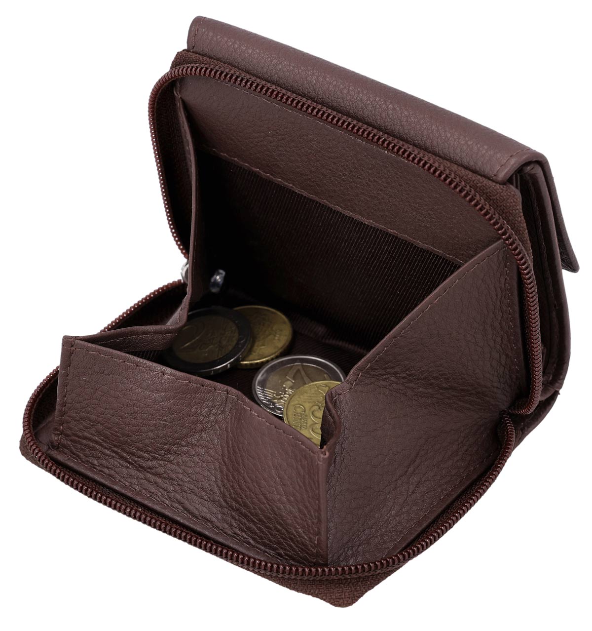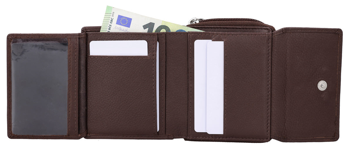 Wewnątrz "Brigitta" znajdziesz przegródkę na banknoty, rozkładane okienko, miejsce na maksymalnie sześć kart oraz oddzielną kieszeń na monety z zamkiem błyskawicznym, która niezawodnie zapobiega wypadaniu monet. Zapięcie na zatrzask z wysokiej jakości skóry trzyma wszystko bezpiecznie razem. Wbudowany blokad RFID blokuje sygnały Twoich kart, dzięki czemu nieupoważnione osoby nie mają szansy na odczytanie Twoich danych. Kompaktowy, stylowy i bezpieczny portfel na każdy dzień.