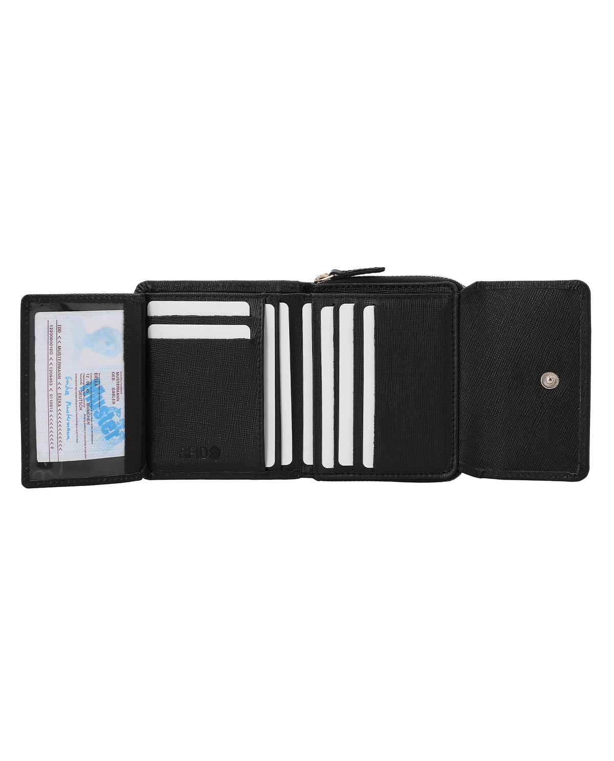 Wewnątrz „Brigitta” posiada przegródkę na banknoty, rozkładane okienko, miejsce na maksymalnie 6 kart oraz oddzielną przegródkę na monety, zamykaną na zamek błyskawiczny. Dzięki temu monety nie wypadają z portfela. Portfel wykonany jest z wysokiej jakości skóry bydlęcej w stylu Saffiano i zamykany jest na zatrzask. Wrzuć go do kieszeni i ruszaj w drogę – z portfelem „Brigitta”!