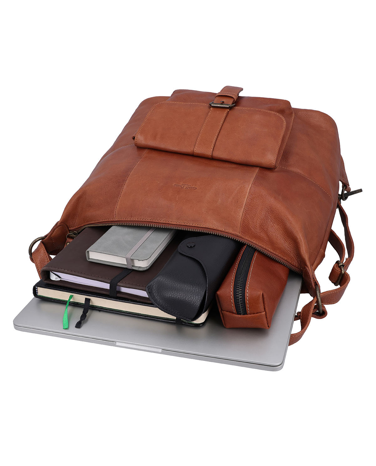 "Armand" oferuje Ci również sprytne możliwości przechowywania, aby bezpiecznie i zorganizowanie schować swoje rzeczy. Oprócz głównej komory, torba posiada przednią kieszeń z klasycznym zapięciem na klamrę oraz dwie wewnętrzne kieszenie, z których jedna ma zamek błyskawiczny na drobne wartościowe przedmioty. Dzięki dwóm regulowanym skórzanym paskom możesz nosić torbę według swoich upodobań jako torbę na ramię lub plecak. Wewnątrz znajduje się również praktyczna naszywka z grawerem, która nadaje torbie osobisty akcent.