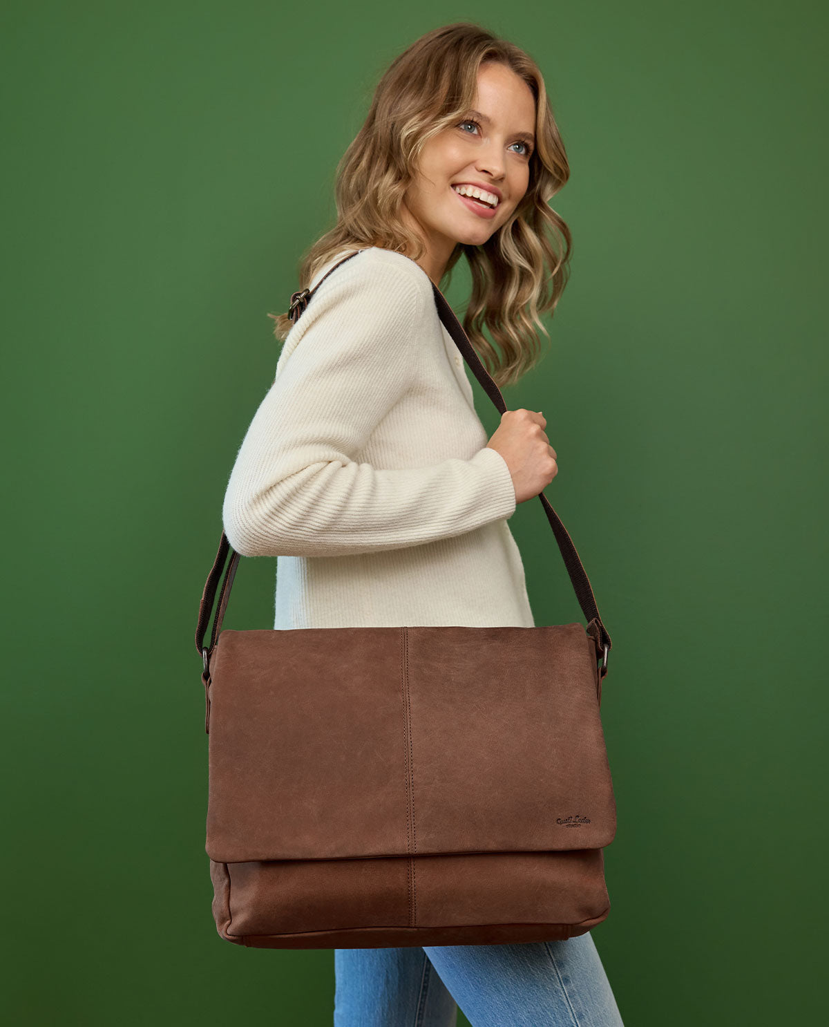 Nasza torba na ramię jest wykonana z wysokiej jakości, wytrzymałej skóry. Odporne na zużycie materiały z czasem nabierają charakteru i rozwijają unikalną patynę. Każda torba jest ręcznie wykonana i posiada swoje indywidualne cechy, co czyni ją unikalnym egzemplarzem. Brązowy kolor nadaje torbie autentyczny wygląd vintage, który doskonale pasuje do każdego stroju. Ponadto, torba oferuje wystarczająco dużo miejsca: Główna komora jest wystarczająco duża na tablet, notebook lub ważne dokumenty. Dwie wewnętrzne kieszenie i kieszeń na zamek błyskawiczny zapewniają porządek, podczas gdy regulowany pasek na ramię zapewnia optymalny komfort noszenia – czy to swobodnie na ramieniu, czy na ukos przez ciało.