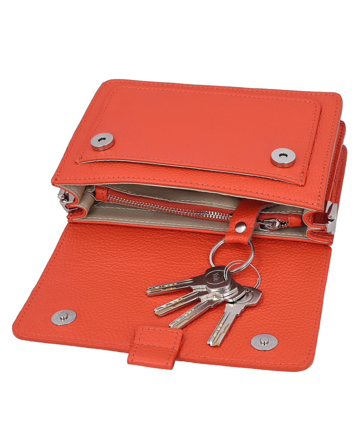 Wewnątrz „Trude” przekonuje sprytnym podziałem: kieszeń zapinana na zamek błyskawiczny chroni twoje cenne przedmioty, a zintegrowany uchwyt na klucze zapewnia porządek. Szczególnie praktyczna jest dyskretnie umieszczona kieszeń na AirTag, która zapewnia dodatkowe bezpieczeństwo w podróży. Kieszeń na kartę umożliwia szybki dostęp do niezbędnych przedmiotów, które chcesz mieć pod ręką. Dopełnieniem projektu jest dyskretna naszywka z grawerunkiem, która umożliwia personalizację. Wybierając„Trude”, decydujesz się na torbę na ramię, która harmonijnie łączy funkcjonalność, styl i indywidualność.